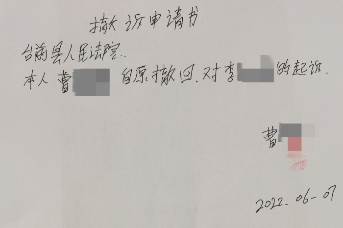 “谢谢法官,这是我的撤诉申请书”。6月7日早上,在台前县人民法院速裁合同法官王刚的指导下,原告曹某当场签字,将撤诉申请递交法院。一件劳务合同纠纷引起的民事案件,被告当场履行义务,原告撤回对其起诉,不仅减轻了双方当事人的诉累,也最大程度的节约了司法资源。